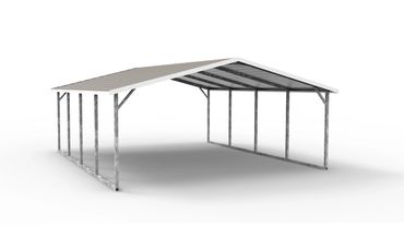 Vertical Roof Style Carport Covers have VERTICAL panels on the roof, and feature a 6" overhang all the way around the structure. Hat channels support the roof panels, and there is a Ridge Cap at the top of the peak. (Water and snow will drain to the sides of this roof.)
