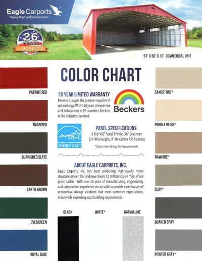 The Eagle Carports models we offer have framing spaced no more than 5' apart, and braces on every leg, standard. These models are Certified and rated to withstand at least 120 mph winds and 25 psf when installed on concrete, and you may upgrade to 35 psf/140 mph for $300 more. (For optional Ground Certification, we will add mobile home anchors to the price.) They come standard with a 90-day workmanship warranty, as well as a 20-year warranty against rust-through on the roofing materials.